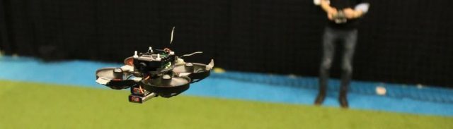 The drone racing team of the MAVLab has presented the currently smallest autonomous racing drone in the world. The drone is 10 cm in diameter and weighs 72 grams. It uses only a single camera and very little onboard processing in order to autonomously fly through a racing track with a speed that rivals that of the fastest, bigger autonomous racing drones.