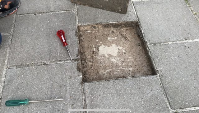 The two men proceeded slowly, constantly checking their tablet to see whether they were still close enough to the pipes. A big cart was pushed forward with the mat dragging behind it. Except for the grinding of the equipment on the sidewalk, everything was quiet.