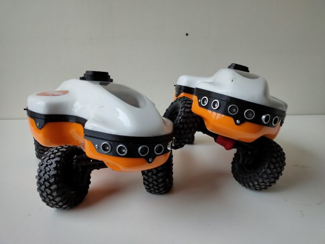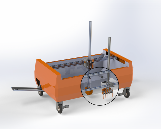 The machine is propelled by two hub motors placed on the front wheels with a high gear ratio which allows the robot to generate the high torque it needs. The robot can be monitored through a web app but can also move autonomously when needed. The positioning of the visionbox can be adjusted manually, as well as the distance between the wheel thus allowing the robot to work in different types of crop fields.