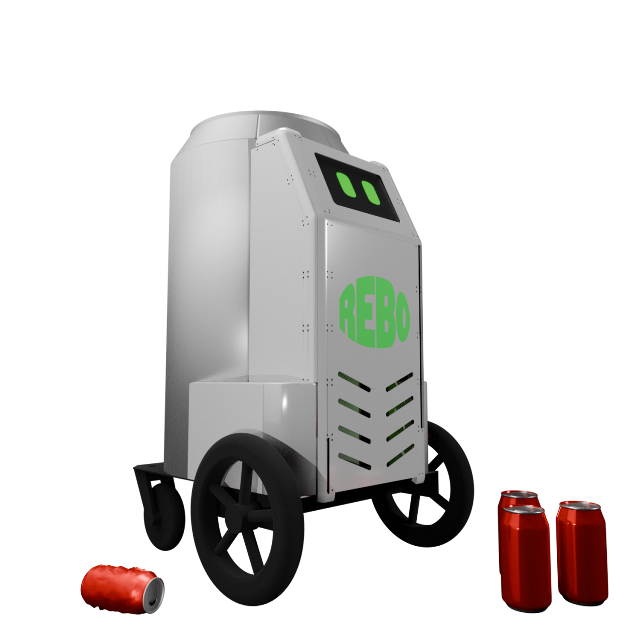 REBO is a mobile robot that can collect, crush, and refund the government deposit of beverage cans. It improves recycling efficiency while raising awareness of littering in nature.