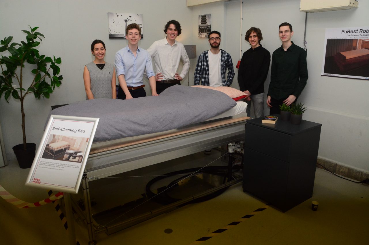 The self-cleaning bed autonomously cleans bed sheets in hotel beds. By flipping a pair of mattresses and cleaning the dirty mattress from beneath, hotel staff save time and effort cleaning rooms.