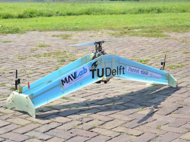 This design makes it significantly easier to take off and land in difficult areas – from a boat, for example. Researcher Bart Remes from TU Delft’s MAVlab explains: “Vertical take-off (or landing) with horizontal flight is not actually new, but never has it been so elegant. Because there is no tail and the aircraft has just a single double-decker wing, it can remain elegantly upright for take-off and landing.”